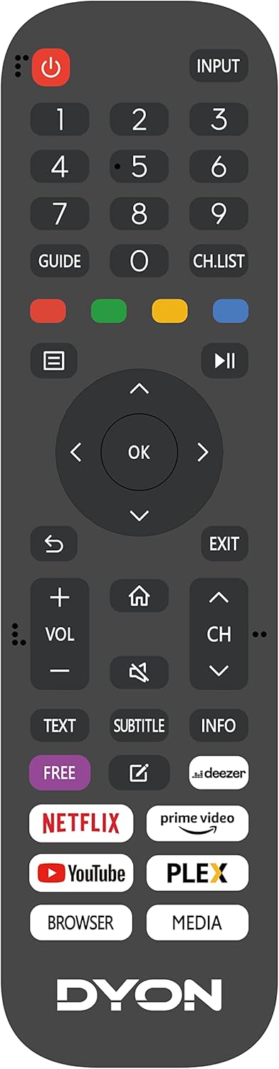 Die mitgelieferte Fernbedienung des Dyon Movie Smart 32 VX TV ist einfach zu bedienen und bietet schnellen Zugriff auf beliebte Streaming-Dienste wie Prime Video, Netflix, YouTube und Deezer. Mit einem einfachen Tastendruck können Sie Ihre Lieblingsinhalte starten und genießen. Die Benutzerfreundlichkeit des Fernsehers wird durch die intuitive Benutzeroberfläche und die übersichtlichen Menüs weiter verbessert. Einfach einzurichten und zu verwenden!