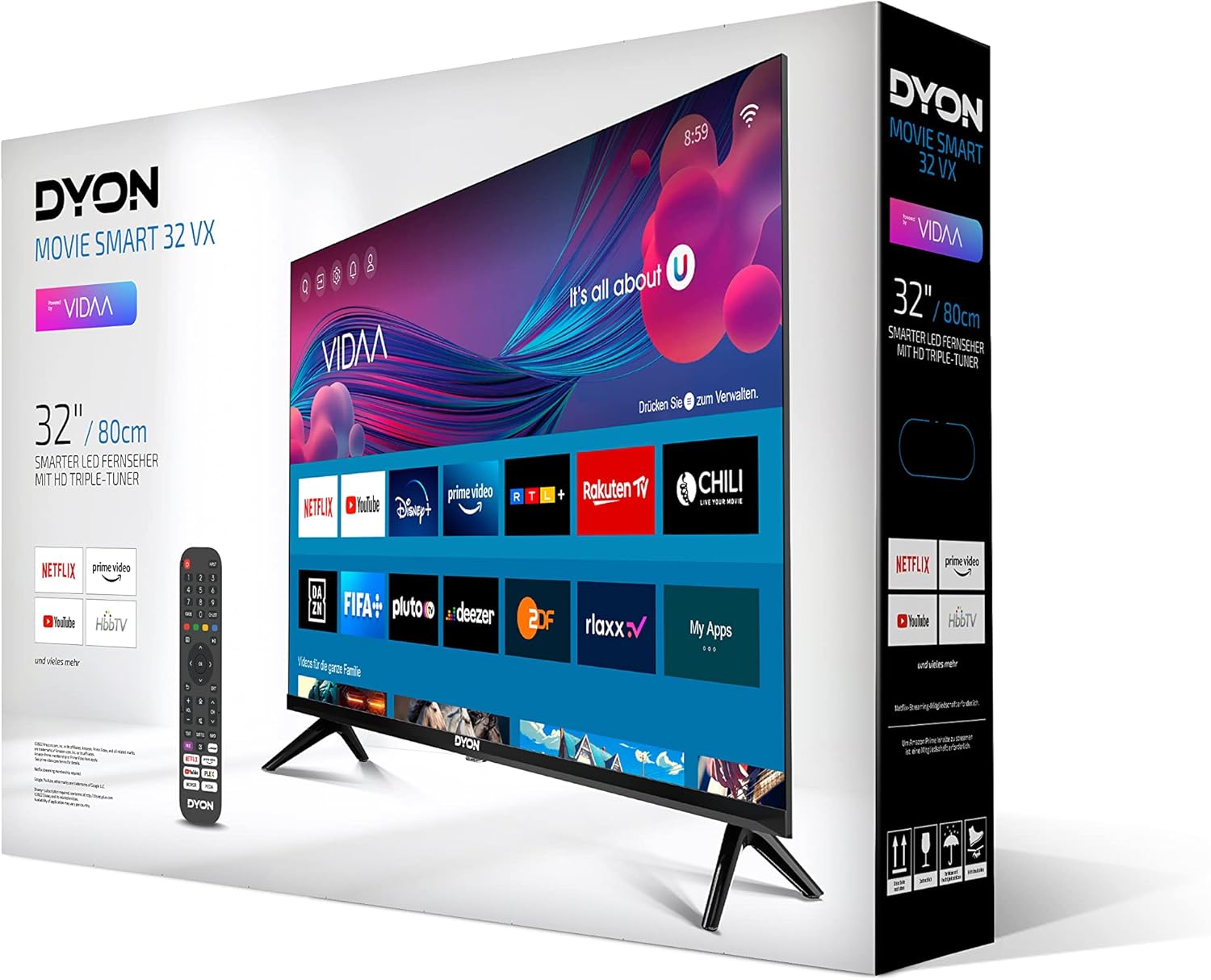 - Lieferumfang: Movie Smart 32 VX, Fernbedienung inkl. Batterien, Standfuß, Schnellstart-Anleitung (Englische Sprache nicht gewährleistet)